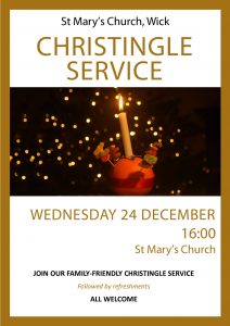 Christingle Service at St Mary’s, Wick Christmas Eve Wednesday 24 December 2025 1600 St Mary’s, Wick All welcome + Add to Google Calendar + iCal / Outlook export Date 24 Dec 2025 Time 4:00 pm - 5:00 pm Category Worship